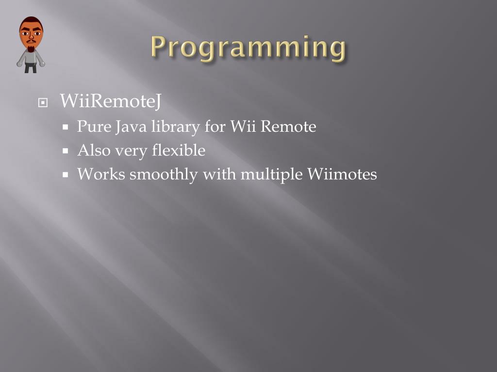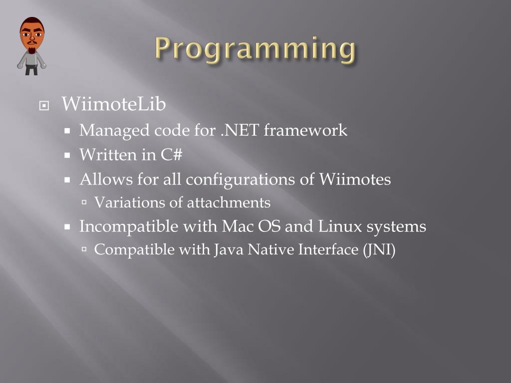 Programming • WiimoteLib • Managed code for .NET framework • Written in C# • Allows for all configurations of Wiimotes • Variations of attachments • Incompatible with Mac OS and Linux systems • Compatible with Java Native Interface (JNI)
