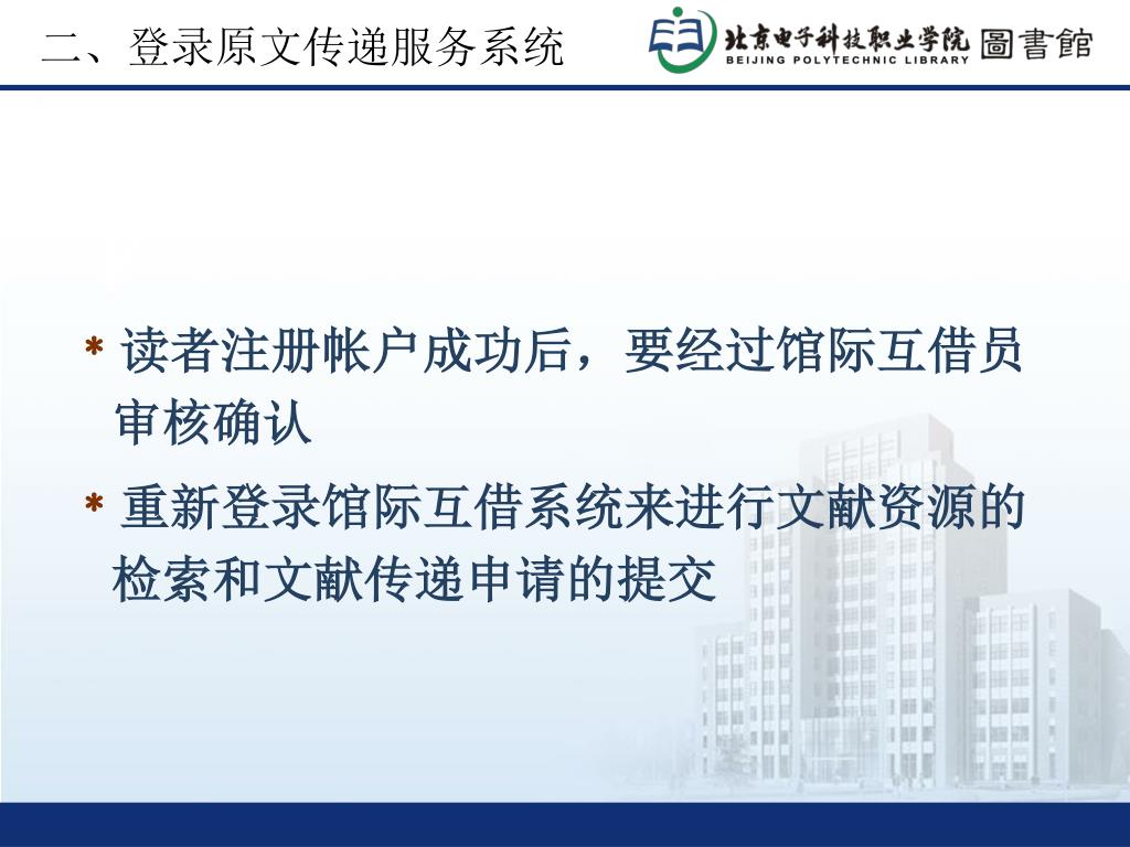 二、登录原文传递服务系统 ﹡读者注册帐户成功后,要经过馆际互借员审核确认 ﹡重新登录馆际互借系统来进行文献资源的检索和文献传递申请的提交