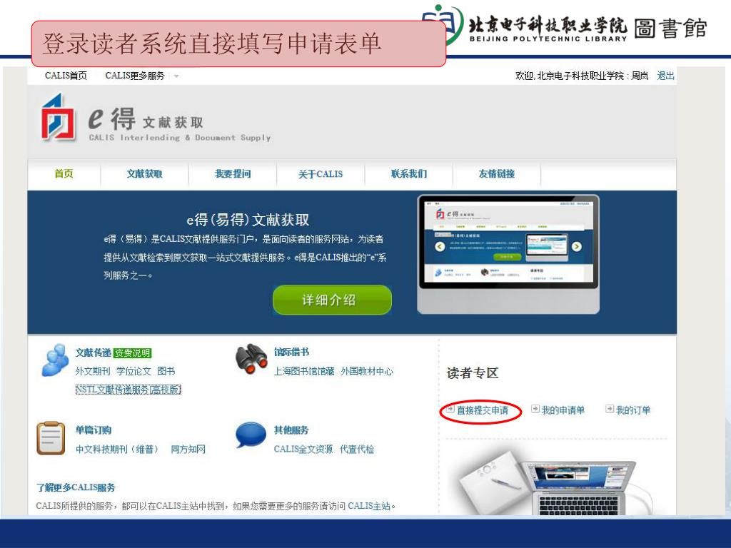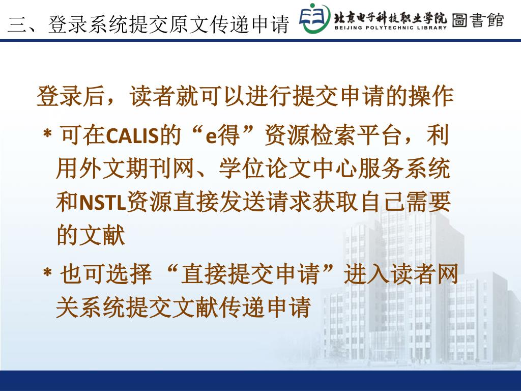 三、登录系统提交原文传递申请 登录后,读者就可以进行提交申请的操作 ﹡可在CALIS的“e得”资源检索平台,利用外文期刊网、学位论文中心服务系统和NSTL资源直接发送请求获取自己需要的文献 ﹡也可选择 “直接提交申请”进入读者网关系统提交文献传递申请