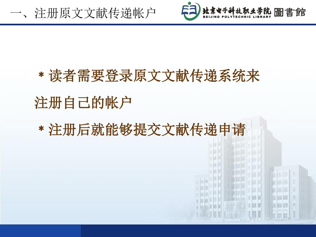 一、注册原文文献传递帐户 ﹡读者需要登录原文文献传递系统来 注册自己的帐户 ﹡注册后就能够提交文献传递申请
