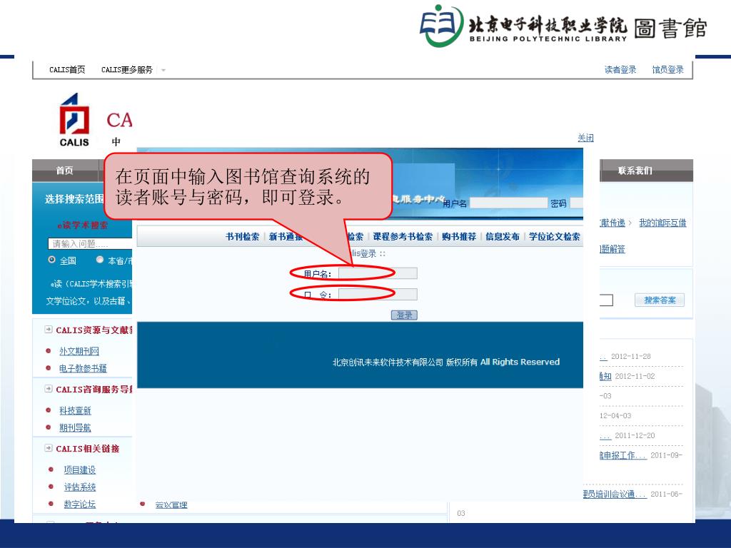 http://www.calis.edu.cn,点击右上角的“读者登录”。http://www.calis.edu.cn,点击右上角的“读者登录”。