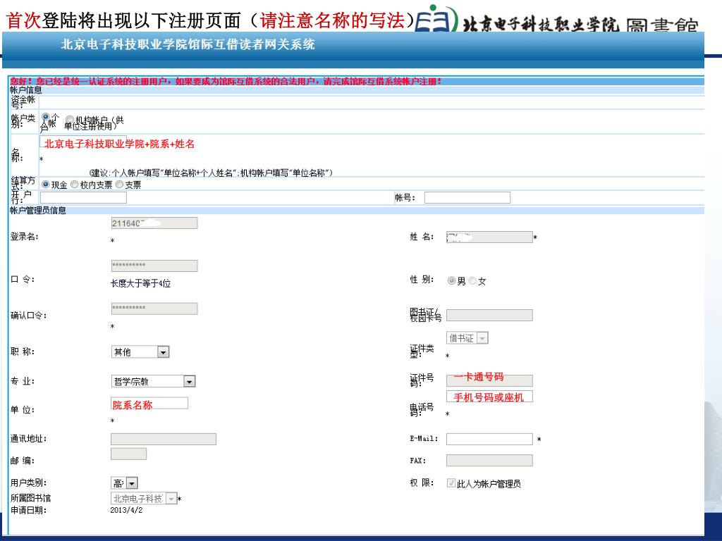 首次登陆将出现以下注册页面(请注意名称的写法)首次登陆将出现以下注册页面(请注意名称的写法) 北京电子科技职业学院+院系+姓名 一卡通号码 手机号码或座机 院系名称