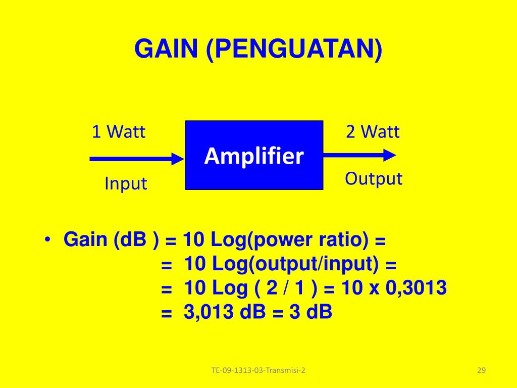 GAIN (PENGUATAN) • Gain (dB ) = 10 Log(power ratio) = = 10 Log(output/input) = = 10 Log ( 2 / 1 ) = 10 x 0,3013 = 3,013 dB = 3 dB 1 Watt 2 Watt Amplifier Output Input TE-09-1313-03-Transmisi-2