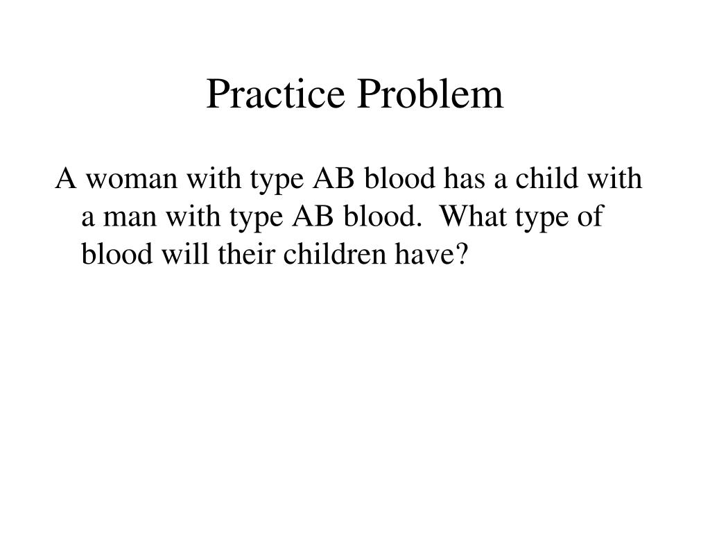 Blood Types – Practice Problems A woman with type O blood type has a baby with a man with type AB blood type. What blood type can their child have?