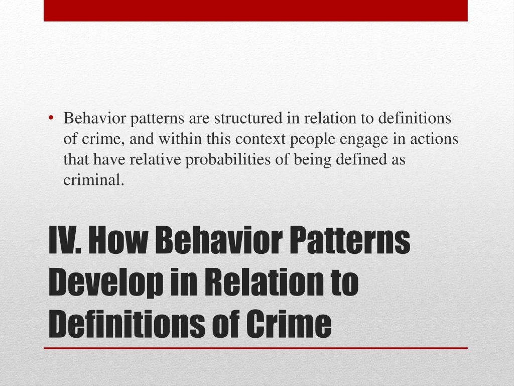 Behavior patterns are structured in relation to definitions of crime, and within this context people engage in actions that have relative probabilities of being defined as criminal. IV. How Behavior Patterns Develop in Relation to Definitions of Crime