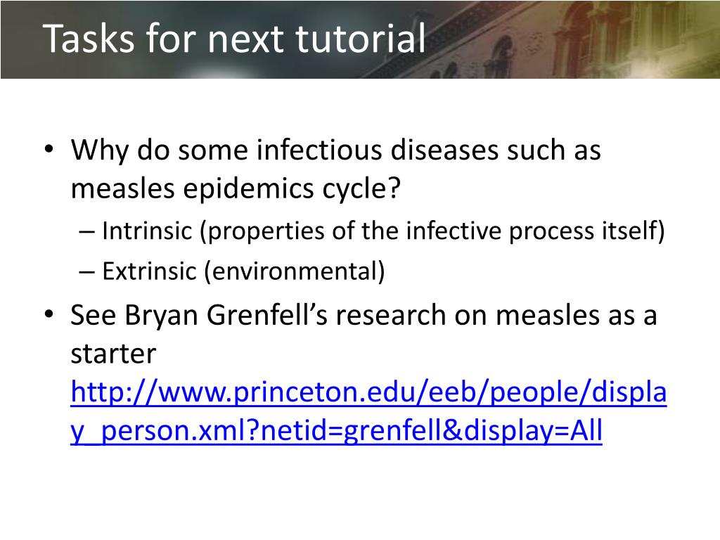 Tasks for next tutorial • Why do some infectious diseases such as measles epidemics cycle? • Intrinsic (properties of the infective process itself) • Extrinsic (environmental) • See Bryan Grenfell’s research on measles as a starter http://www.princeton.edu/eeb/people/display_person.xml?netid=grenfell&display=All