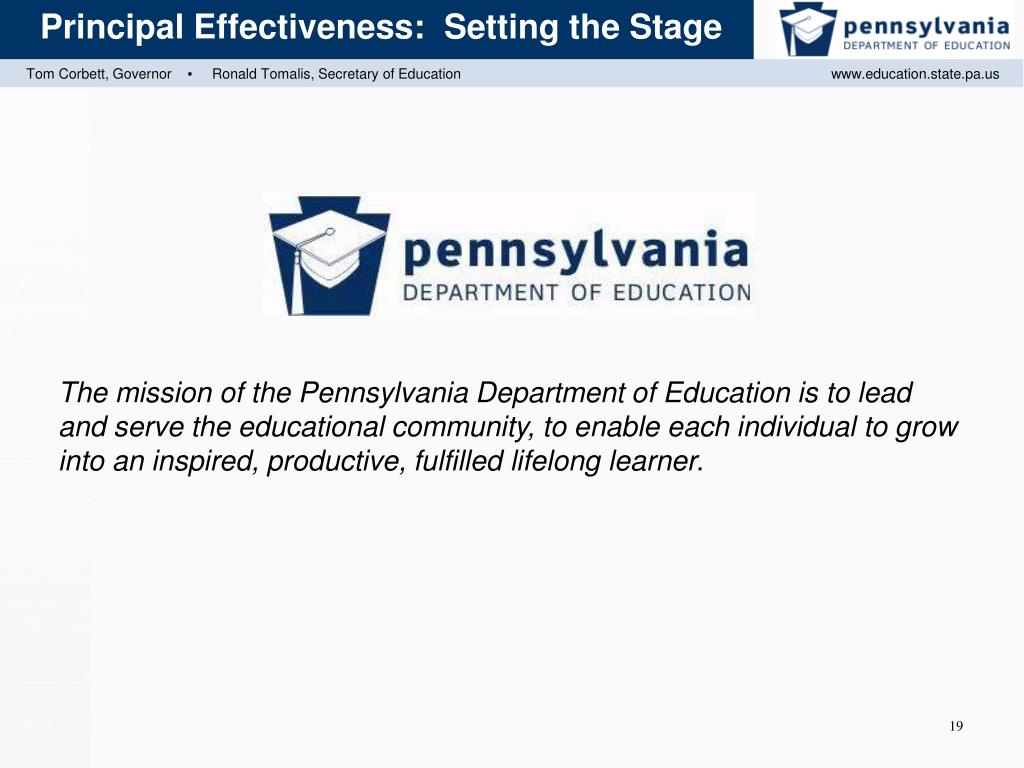 The mission of the Pennsylvania Department of Education is to lead and serve the educational community, to enable each individual to grow into an inspired, productive, fulfilled lifelong learner. 19