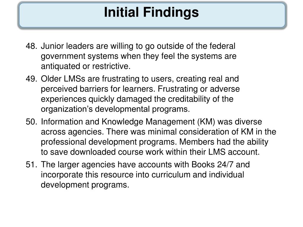 Junior leaders are willing to go outside of the federal government systems when they feel the systems are antiquated or restrictive. • Older LMSs are frustrating to users, creating real and perceived barriers for learners. Frustrating or adverse experiences quickly damaged the creditability of the organization’s developmental programs. • Information and Knowledge Management (KM) was diverse across agencies. There was minimal consideration of KM in the professional development programs. Members had the ability to save downloaded course work within their LMS account. • The larger agencies have accounts with Books 24/7 and incorporate this resource into curriculum and individual development programs. Initial Findings
