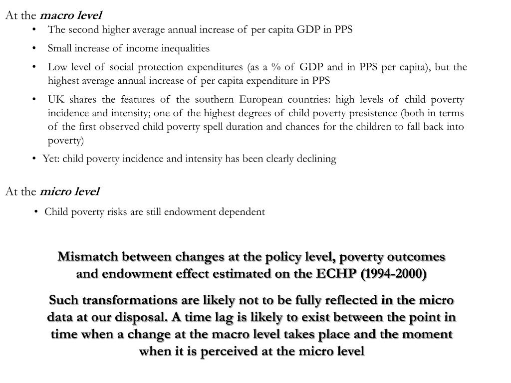 At the macro level • The second higher average annual increase of per capita GDP in PPS • Small increase of income inequalities • Low level of social protection expenditures (as a % of GDP and in PPS per capita), but the highest average annual increase of per capita expenditure in PPS • UK shares the features of the southern European countries: high levels of child poverty incidence and intensity; one of the highest degrees of child poverty presistence (both in terms of the first observed child poverty spell duration and chances for the children to fall back into poverty) • Yet: child poverty incidence and intensity has been clearly declining At the micro level • Child poverty risks are still endowment dependent Mismatch between changes at the policy level, poverty outcomes and endowment effect estimated on the ECHP (1994-2000) Such transformations are likely not to be fully reflected in the micro data at our disposal. A time lag is likely to exist between the point in time when a change at the macro level takes place and the moment when it is perceived at the micro level