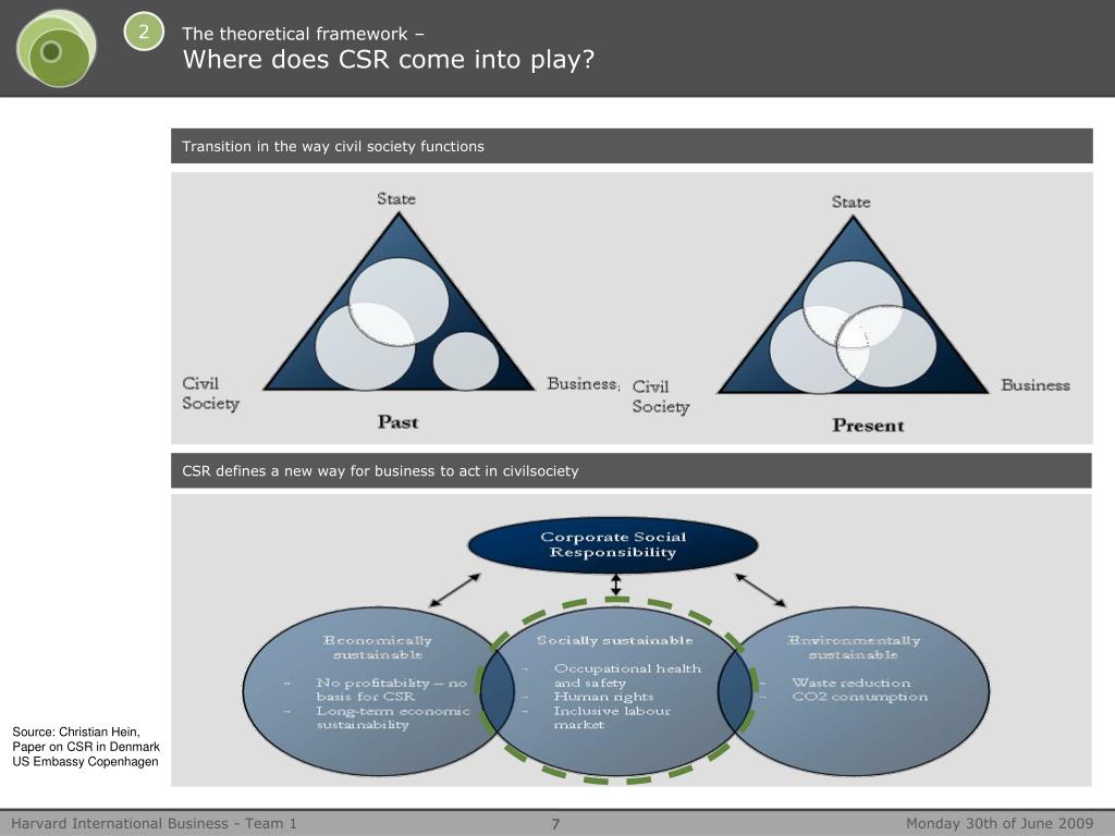 The theoretical framework –Wheredoes CSR comeintoplay? 2 Transition in the way civil society functions CSR defines a new way for business to act in civilsociety Source: Christian Hein, Paper on CSR in Denmark US Embassy Copenhagen