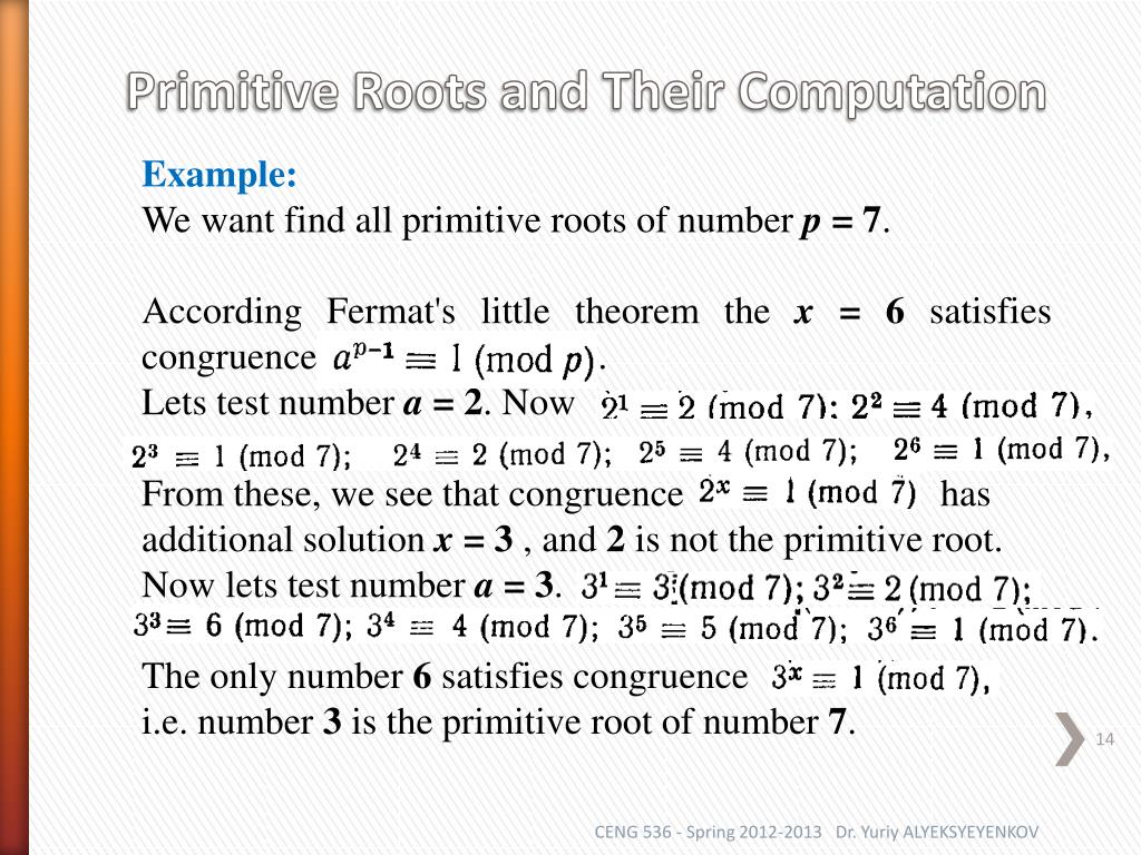 Theorem 5. If solution satisfies congruence another number where k – is integer, will satisfies it. Multiplying congruence by itself k times gives congruence that constitutes the statement of the theorem. In general, depending of a and p there may be arbitrary number of solutions. In particular case, when for a and p there is the only solution number a is referred to as primitive root of number p. Primitive Roots and Their Computation CENG 536 - Spring 2012-2013 Dr. Yuriy ALYEKSYEYENKOV