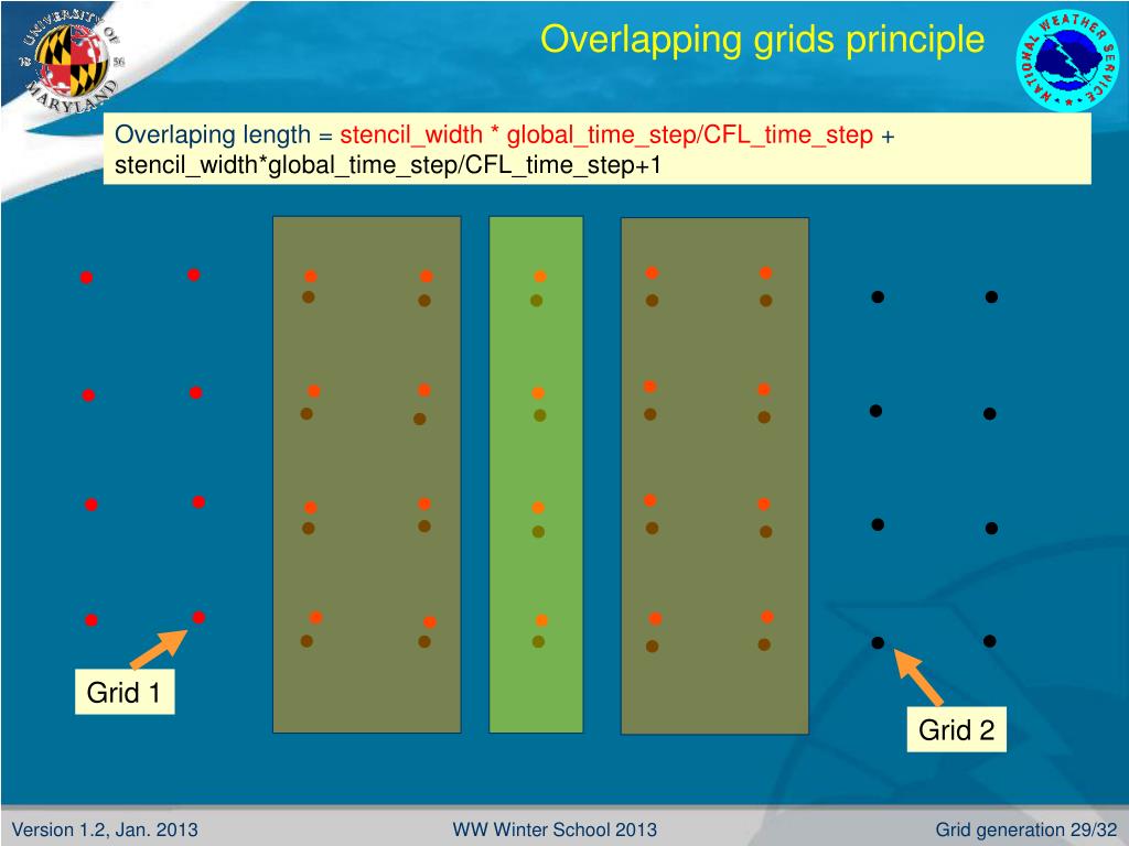 Overlapping grids principle Overlaping length = stencil_width * global_time_step/CFL_time_step + stencil_width*global_time_step/CFL_time_step+1 Grid 1 Grid 2