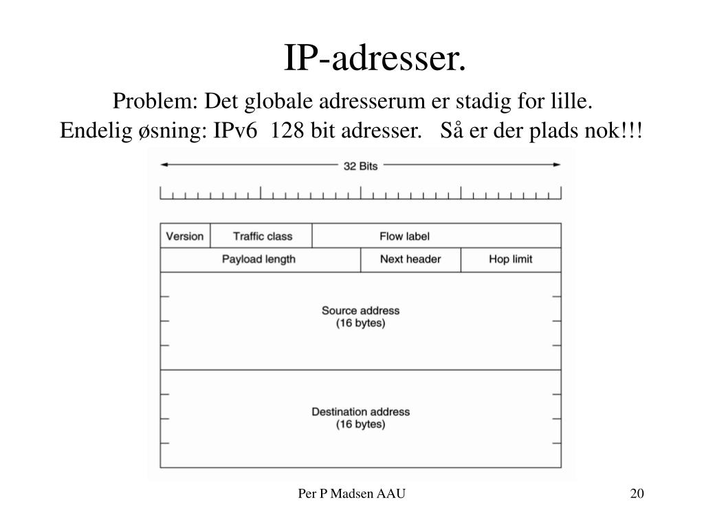 IP-adresser. Problem: Det globale adresserum er stadig for lille. Endelig øsning: IPv6 128 bit adresser. Så er der plads nok!!! Per P Madsen AAU