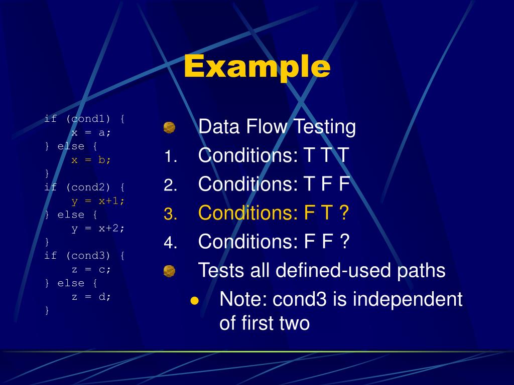 Example if (cond1) { x = a; } else { x = b; } if (cond2) { y = x+1; } else { y = x+2; } if (cond3) { z = c; } else { z = d; } • Logic Coverage / Code Coverage • Conditions: T T T • Conditions: T T F • Conditions: T F T • Conditions: T F F • Conditions: F T T • Conditions: F T F • Conditions: F F T • Conditions: F F F • Tests all possible paths