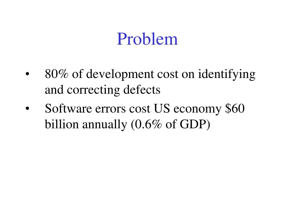 Problem • 80% of development cost on identifying and correcting defects • Software errors cost US economy $60 billion annually (0.6% of GDP)