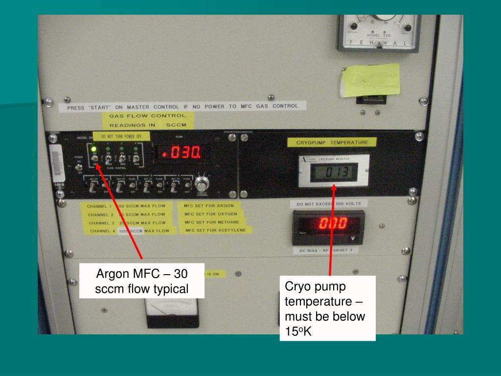Argon MFC – 30 sccm flow typical Cryo pump temperature – must be below 15oK