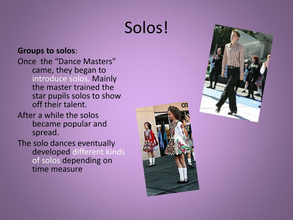 Solos! Groups to solos: Once the “Dance Masters” came, they began to introduce solos. Mainly the master trained the star pupils solos to show off their talent. After a while the solos became popular and spread. The solo dances eventually developed different kinds of solos depending on time measure