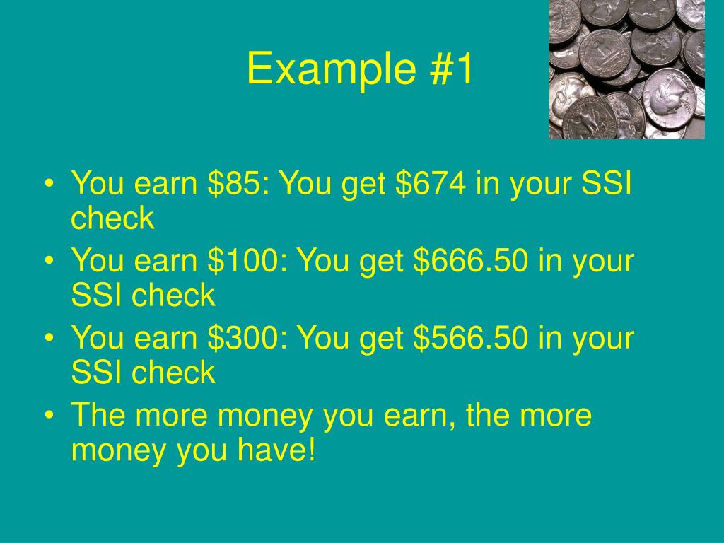 Example #1 • You earn $85: You get $674 in your SSI check • You earn $100: You get $666.50 in your SSI check • You earn $300: You get $566.50 in your SSI check • The more money you earn, the more money you have!