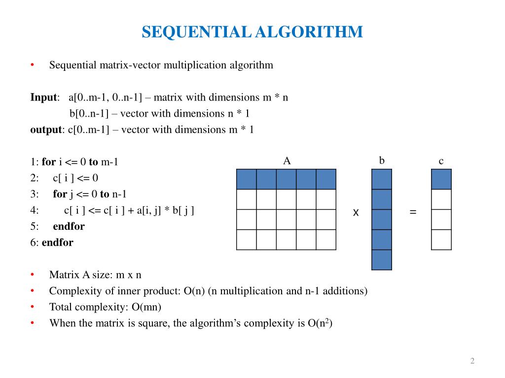 SEQUENTIAL ALGORITHM • Sequential matrix-vector multiplication algorithm Input: a[0..m-1, 0..n-1] – matrix with dimensions m * n b[0..n-1] – vector with dimensions n * 1 output: c[0..m-1] – vector with dimensions m * 1 1: for i <= 0 to m-1 2: c[ i ] <= 0 3: for j <= 0 to n-1 4: c[ i ] <= c[ i ] + a[i, j] * b[ j ] 5: endfor 6: endfor • Matrix A size: m x n • Complexity of inner product: O(n) (n multiplication and n-1 additions) • Total complexity: O(mn) • When the matrix is square, the algorithm’s complexity is O(n2) b A c x =