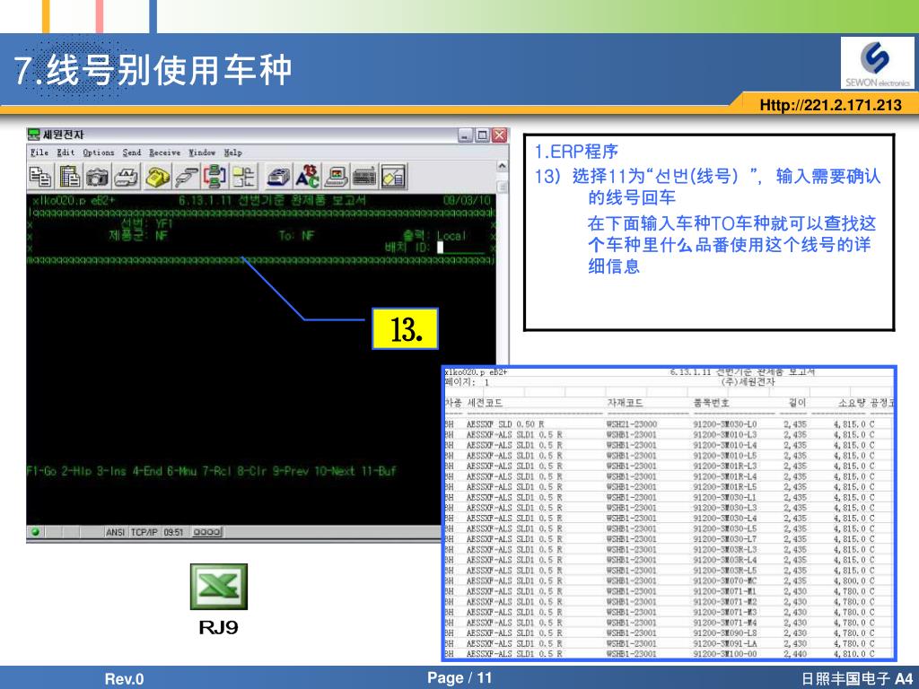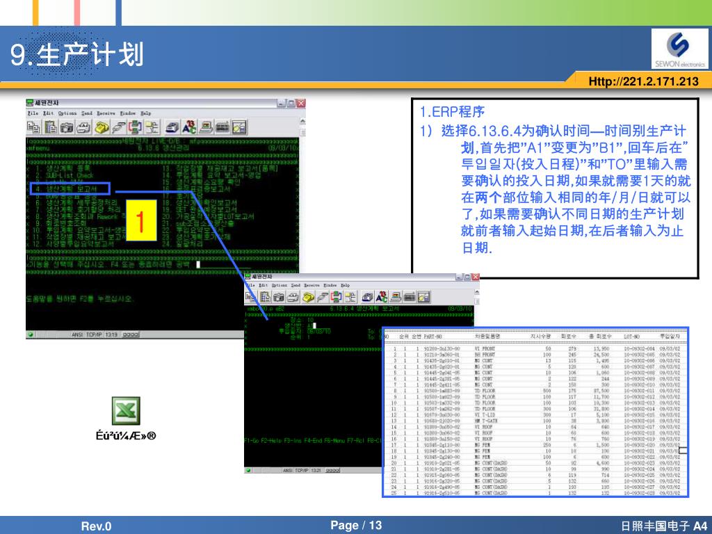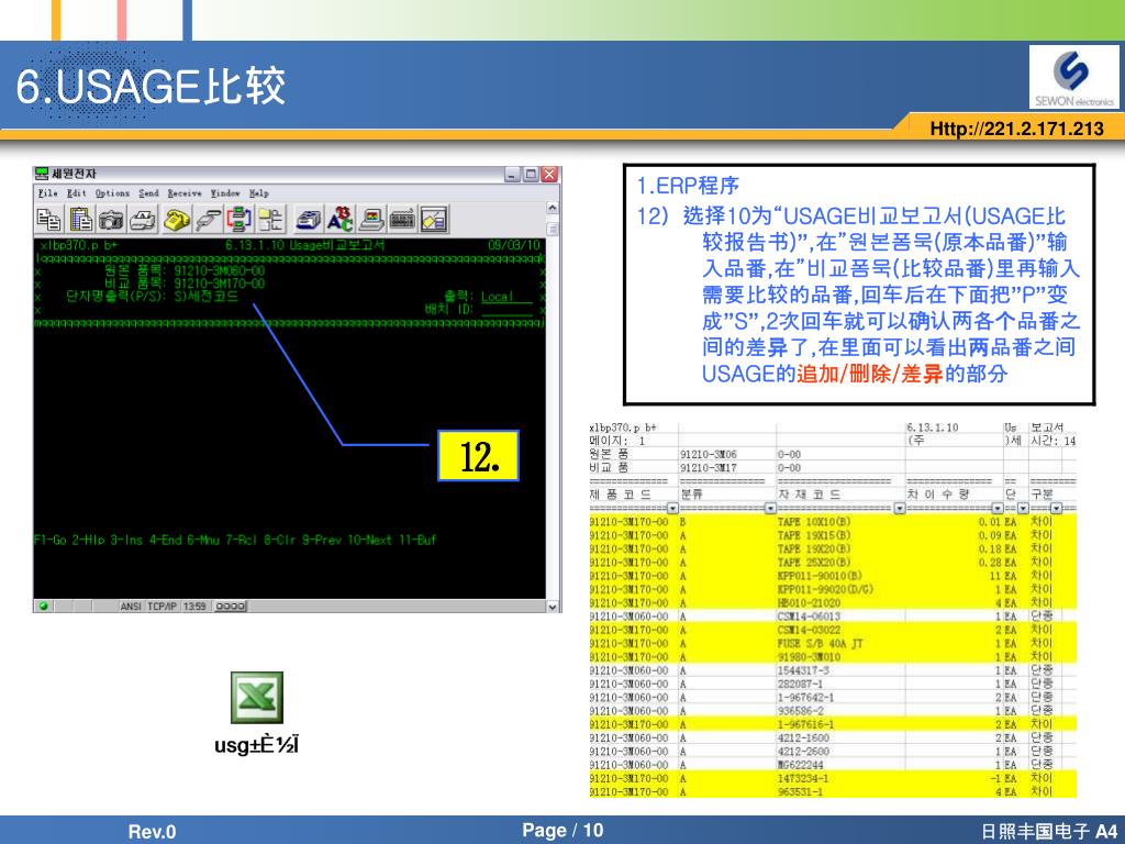 Rev.0. 关联 Process :. 技术用 ERP 内容. 说明书 NO : 作成 部门 : 技术开发. AGENDA. 目录. 0. 制 / 改定履历 1. ERP 使用顺序 2 . 确认改正 LIST 3. 确认 USAGE 4. 确认 SUB LIST 5. 品番别 SUB LIST 比较 6. 品番别 USAGE 比较 7. 线号别使用车种 8. 部品别使用车种 9. 生产计划. 0. 制 / 改正 履历. ERP 使用 说明书. ⒈. ⒉. ⒊. ⒋.