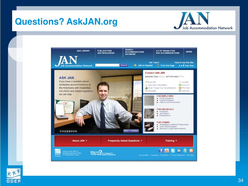 Work that Works • Contact • (800) 526-7234 (V) & (877) 781-9403 (TTY) • (304) 216-8189 via text • AskJAN.org & jan@askjan.org • janconsultants via Skype