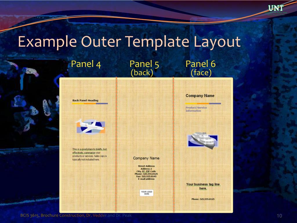 The Process for Making a Brochure • Acquire focused materials • Digitize, edit as needed (later in 3615) • Select paper type (BUSI 152) and corresponding template • Print drafts; edit • Print final copy using RJE room (BA 151) printer