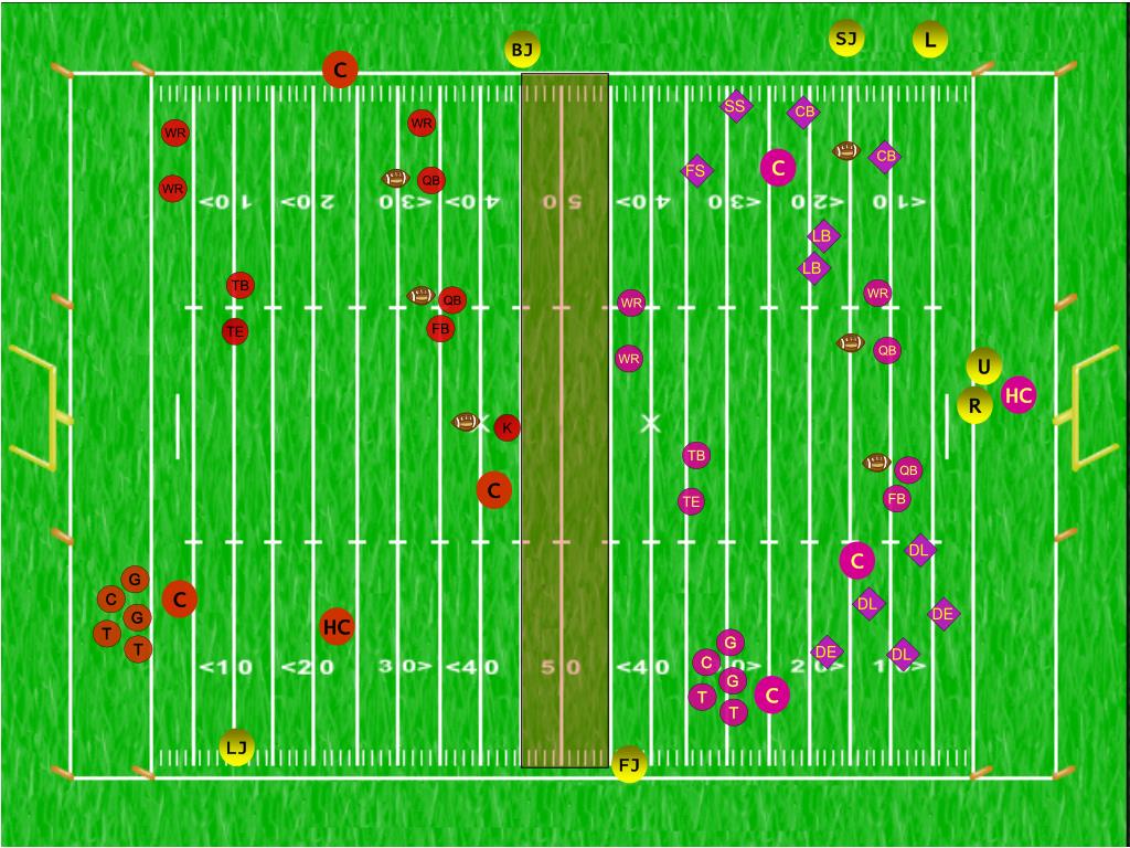 Home. FJ. U. BJ. Before you start your Pre-game Duties, huddle on the50 yard line (Home Side line). SJ. LJ. L. ECO. R. Pre-Game Duties. LB. CB. SS. DL. DE. DE. DL. DL. CB. LB. FS. SJ. L. BJ. C. WR. WR. C. QB. WR. TB. WR. QB. WR. FB. TE. QB. WR. U. HC.