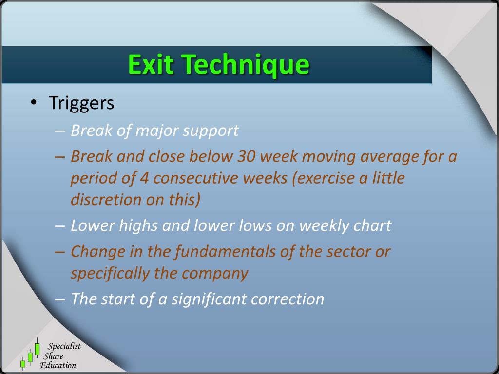 Exit Technique • Triggers • Break of major support • Break and close below 30 week moving average for a period of 4 consecutive weeks (exercise a little discretion on this) • Lower highs and lower lows on weekly chart • Change in the fundamentals of the sector or specifically the company • The start of a significant correction