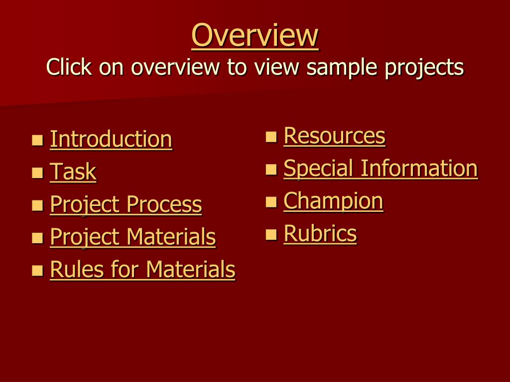 Introduction Task Project Process Project Materials Rules for Materials Resources Special Information Champion Rubrics OverviewClick on overview to view sample projects