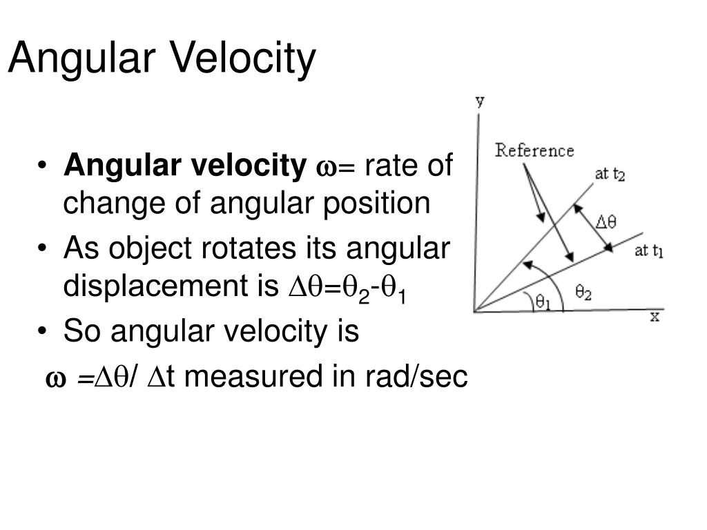 Angular Velocity • Angular velocity = rate of change of angular position • As object rotates its angular displacement is ∆=2-1 • So angular velocity is =∆/ ∆tmeasured in rad/sec