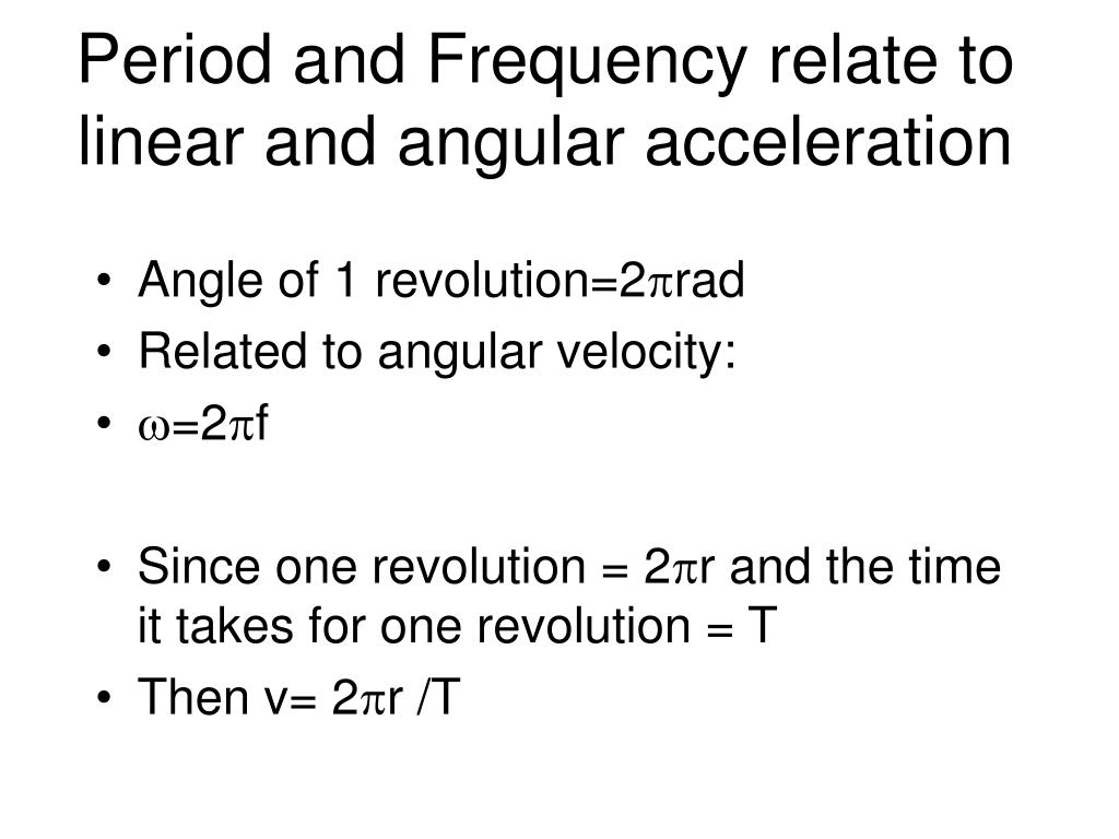 Period and Frequency relate to linear and angular acceleration • Angle of 1 revolution=2rad • Related to angular velocity: • =2f • Since one revolution = 2r and the time it takes for one revolution = T • Then v= 2r /T