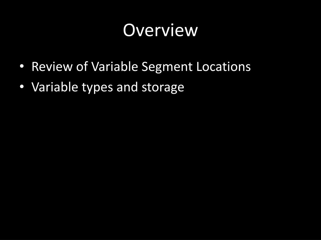 Overview • Review of Variable Segment Locations • Variable types and storage