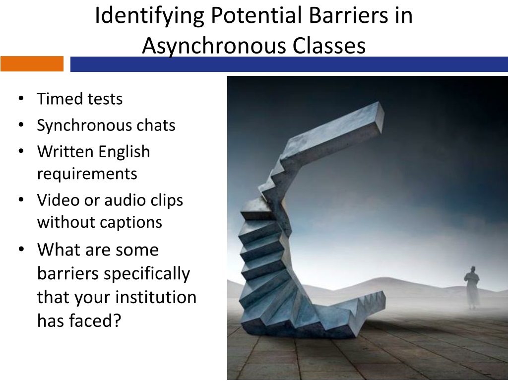 Identifying Potential Barriers in Asynchronous Classes • Timed tests • Synchronous chats • Written English requirements • Video or audio clips without captions • What are some barriers specifically that your institution has faced?