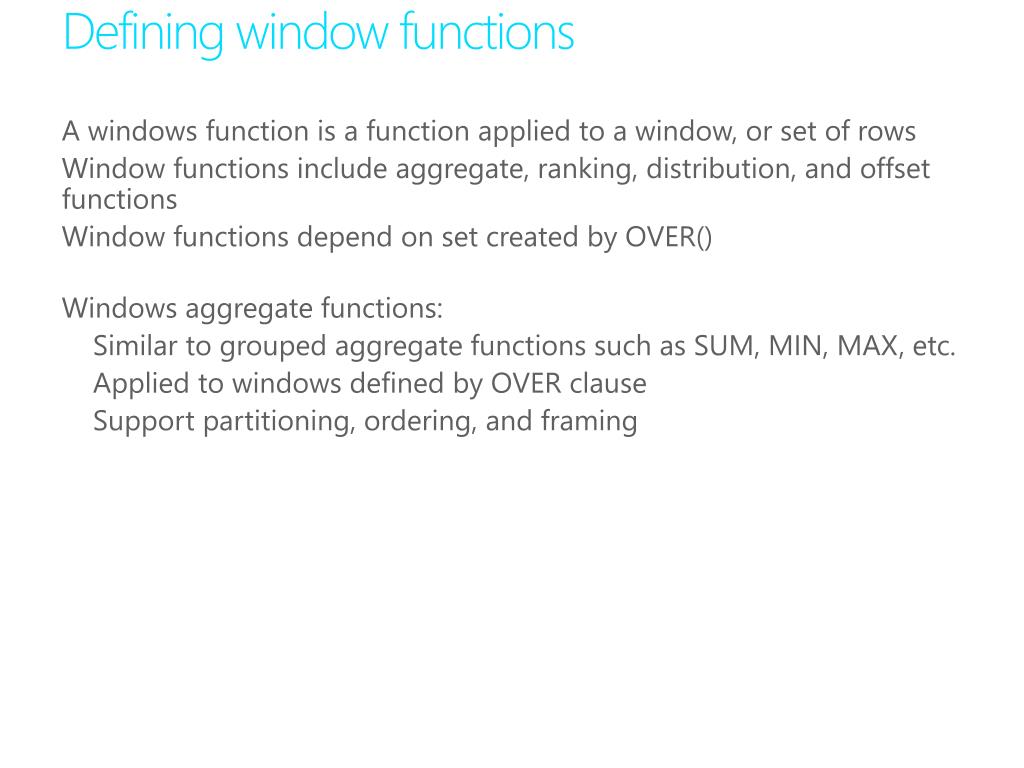 Defining window functions • A windows function is a function applied to a window, or setof rows • Window functions include aggregate, ranking, distribution, and offset functions • Window functions depend on set created by OVER() • Windows aggregate functions: • Similar to grouped aggregate functions such as SUM, MIN, MAX, etc. • Applied to windows defined by OVER clause • Support partitioning, ordering, and framing