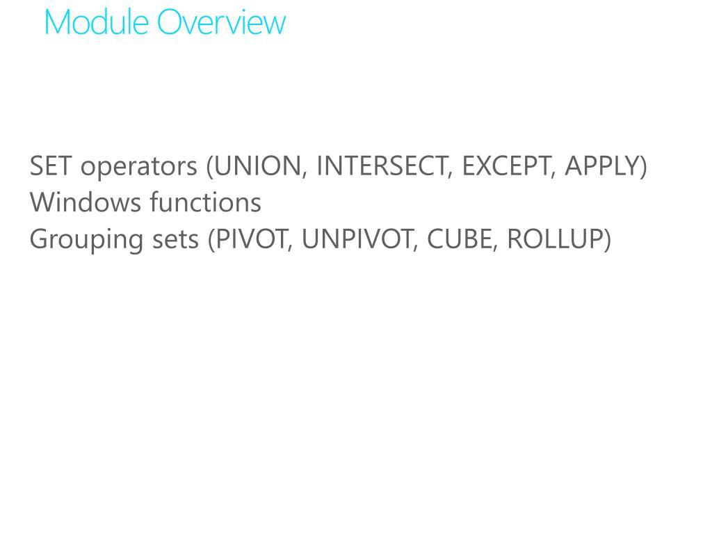 SET operators (UNION, INTERSECT, EXCEPT, APPLY) Windows functions Grouping sets (PIVOT, UNPIVOT, CUBE, ROLLUP) Module Overview