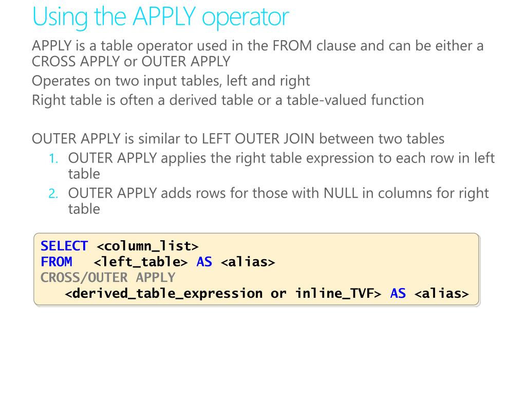 Using the APPLY operator • APPLY is a table operator used in the FROM clause and can be either a CROSS APPLY or OUTER APPLY • Operates on two input tables, left and right • Right table is often a derived table or a table-valued function • OUTER APPLY is similar to LEFT OUTER JOIN between two tables • OUTER APPLY applies the right table expression to each row in left table • OUTER APPLY adds rows for those with NULL in columns for right table SELECT<column_list> FROM <left_table> AS<alias> CROSS/OUTER APPLY <derived_table_expression or inline_TVF> AS <alias>