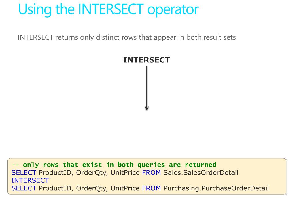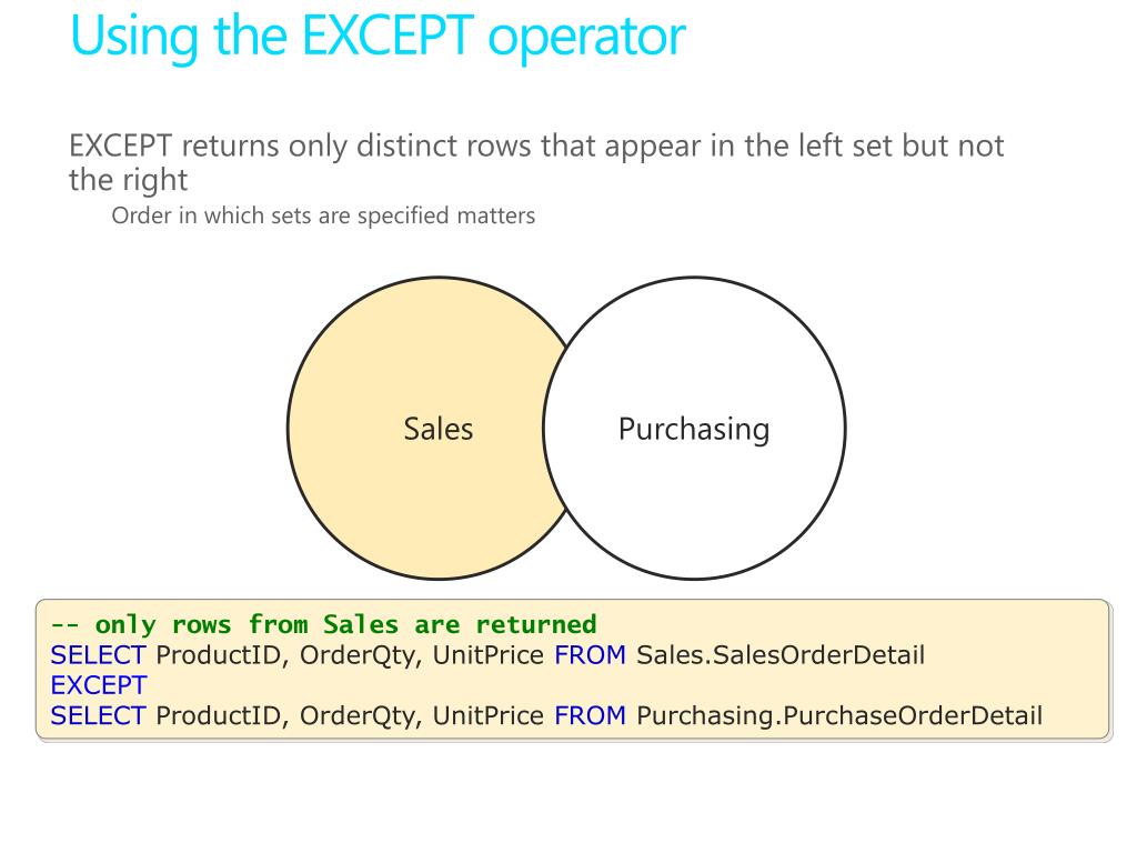 Summary -- only distinct rows from both queries are returned SELECTProductID, OrderQty, UnitPriceFROM Sales.SalesOrderDetail UNION SELECT ProductID, OrderQty, UnitPriceFROM Purchasing.PurchaseOrderDetail -- all rows from both queries are returned SELECTProductID, OrderQty, UnitPriceFROM Sales.SalesOrderDetail UNION ALL SELECT ProductID, OrderQty, UnitPriceFROM Purchasing.PurchaseOrderDetail -- only rows that exist in both queries are returned SELECTProductID, OrderQty, UnitPriceFROM Sales.SalesOrderDetail INTERSECT SELECT ProductID, OrderQty, UnitPriceFROM Purchasing.PurchaseOrderDetail -- only rows from Sales are returned SELECTProductID, OrderQty, UnitPriceFROM Sales.SalesOrderDetail EXCEPT SELECT ProductID, OrderQty, UnitPriceFROM Purchasing.PurchaseOrderDetail