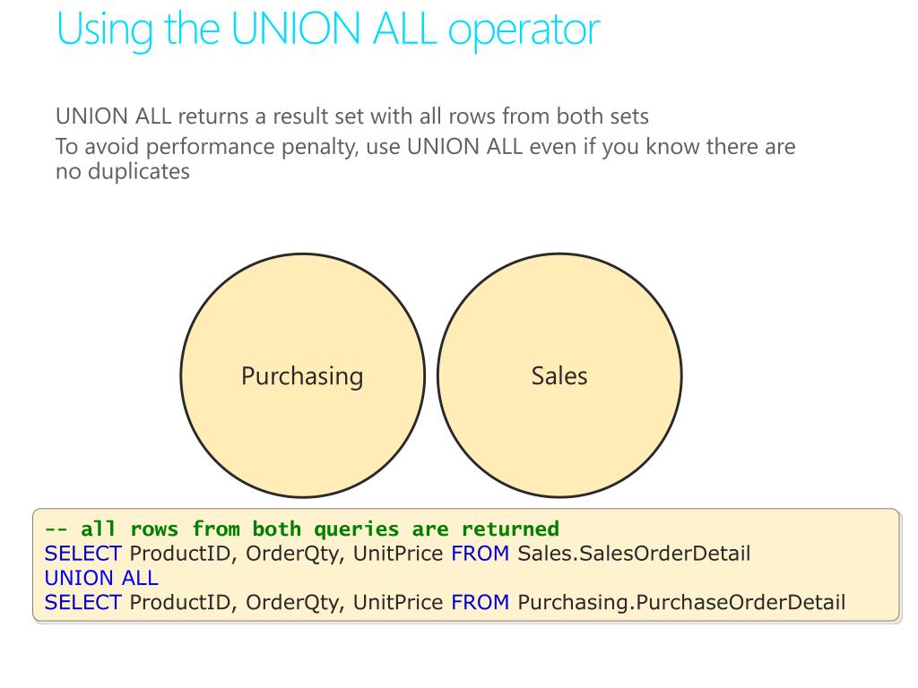 Using the UNION operator • UNION returns a result set of distinct rows combined from both sides • Duplicates removed during query processing (affects performance) -- only distinct rows from both queries are returned SELECTProductID, OrderQty, UnitPriceFROM Sales.SalesOrderDetail UNION SELECT ProductID, OrderQty, UnitPriceFROM Purchasing.PurchaseOrderDetail