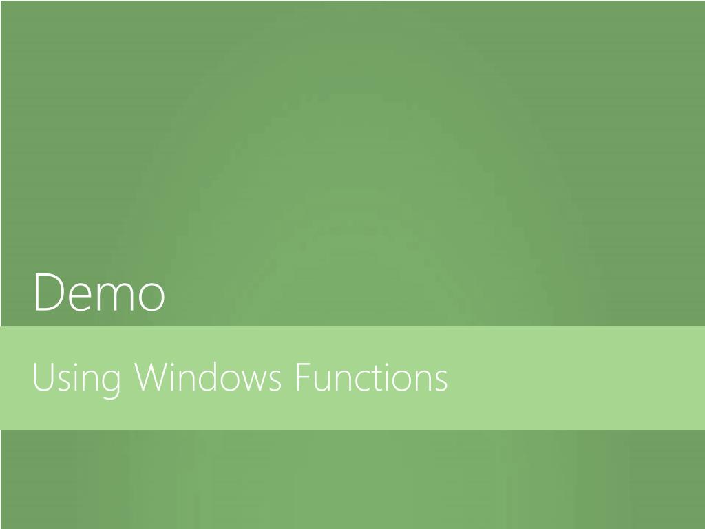 Partitioning windows • Partitioning limits a set to rows with same value in the partitioning column • Use PARTITION BY in the OVER() clause • Without a PARTITION BY clause defined, OVER() creates a single partition of all rows SELECTCustomerID, OrderDate, TotalDue, SUM(TotalDue) OVER(PARTITION BY CustomerID) ASTotalDueByCust FROMSales.SalesOrderHeader; CustomerIDOrderDateTotalDueTotalDueByCust ---------- -------------------------- -------- -------------- 2007-08-01 00:00:00.000 3756.989 9115.1341 11000 2007-10-01 00:00:00.000 2587.8769 9115.1341 11000 2006-09-01 00:00:00.000 2770.2682 9115.1341 11001 2007-08-01 00:00:00.000 2674.0227 7054.1875 11001 2006-11-01 00:00:00.000 3729.364 7054.1875 11001 2007-04-01 00:00:00.000 650.8008 7054.1875