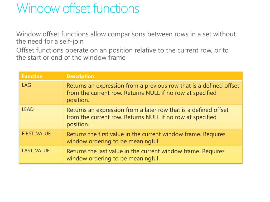 Window offset functions • Window offset functions allow comparisons between rows in a set without the need for a self-join • Offset functions operate on an position relative to the current row, or to the start or end of the window frame