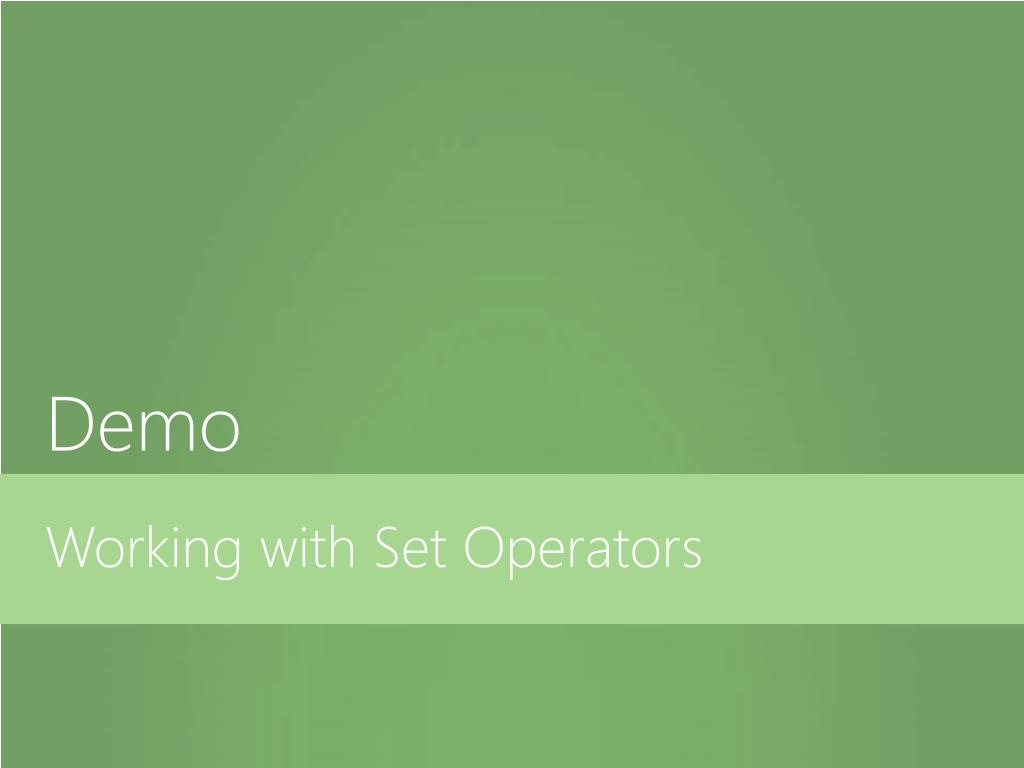 Using the EXCEPT operator • EXCEPT returns only distinct rows that appear in the left set but not the right • Order in which sets are specified matters -- only rows from Sales are returned SELECTProductID, OrderQty, UnitPriceFROM Sales.SalesOrderDetail EXCEPT SELECT ProductID, OrderQty, UnitPriceFROM Purchasing.PurchaseOrderDetail