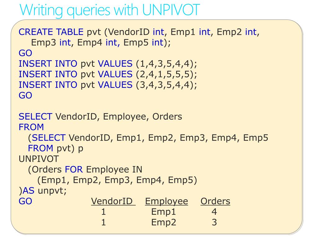 Writing queries with UNPIVOT CREATE TABLE pvt (VendorIDint, Emp1 int, Emp2 int, Emp3 int, Emp4 int, Emp5 int); GO INSERT INTO pvtVALUES (1,4,3,5,4,4); INSERT INTO pvtVALUES (2,4,1,5,5,5); INSERT INTO pvtVALUES (3,4,3,5,4,4); GO SELECTVendorID, Employee, Orders FROM (SELECTVendorID, Emp1, Emp2, Emp3, Emp4, Emp5 FROMpvt) p UNPIVOT (Orders FOR Employee IN (Emp1, Emp2, Emp3, Emp4, Emp5) )ASunpvt; GO VendorIDEmployeeOrders 1 Emp1 4 1 Emp2 3