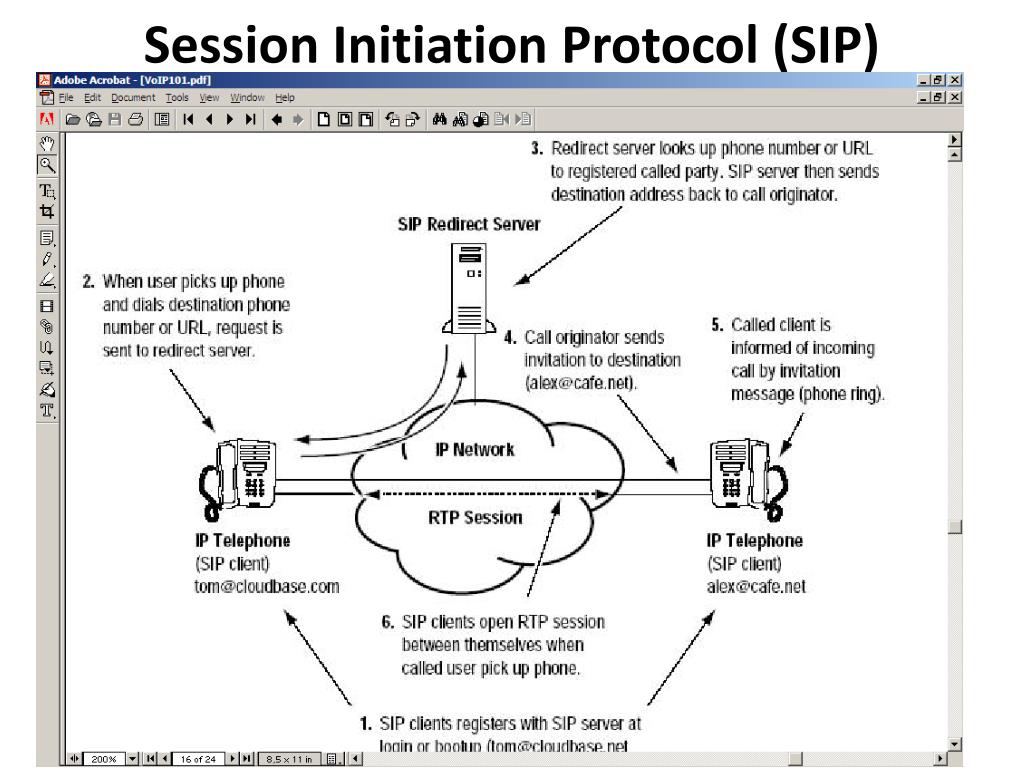 Session Initiation Protocol (SIP) • Client-server signaling protocol that handles the setup and tear down of multimedia sessions between speakers; these sessions can include multimedia conferences, telephone calls, and multimedia distribution. • SIP is a text-based signaling protocol transported over either TCP or UDP, and is designed to be lightweight. It inherited some design philosophy and architecture from the Hypertext Transfer Protocol (HTTP) and Simple Mail Transfer Protocol (SMTP) to ensure its simplicity, efficiency and extensibility. • SIP uses invitations to create Session Description Protocol (SDP) messages to carry out capability exchange and to setup call control channel use. These invitations allow participants to agree on a set of compatible media types. • SIP supports user mobility by proxying and redirecting requests to the user's current location. Users can inform the server of their current location (IP address or URL) by sending a registration message to a registrar. This function is powerful and often needed for a highly mobile voice user base.
