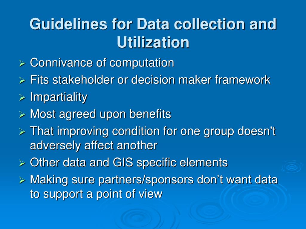 Guidelines for Data collection and Utilization Connivance of computation Fits stakeholder or decision maker framework Impartiality Most agreed upon benefits That improving condition for one group doesn't adversely affect another Other data and GIS specific elements Making sure partners/sponsors don’t want data to support a point of view