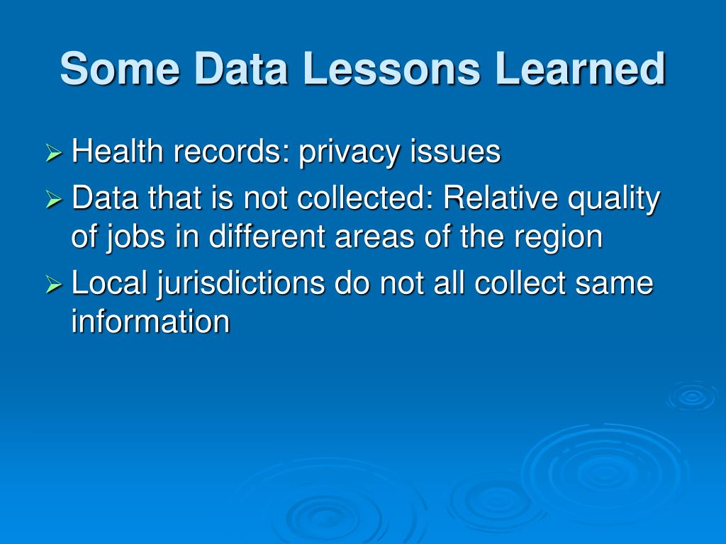 Some Data Lessons Learned Health records: privacy issues Data that is not collected: Relative quality of jobs in different areas of the region Local jurisdictions do not all collect same information