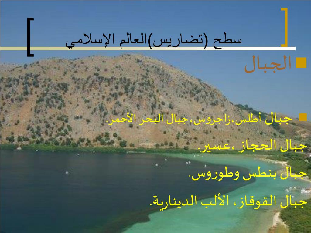 سطح (تضاريس)العالم الإسلامي • الجبال • جبال أطلس،زاجروس،جبال البحر الأحمر. جبال الحجاز ،عسير. جبال بنطس وطوروس. جبال القوقاز، الألب الدينارية.