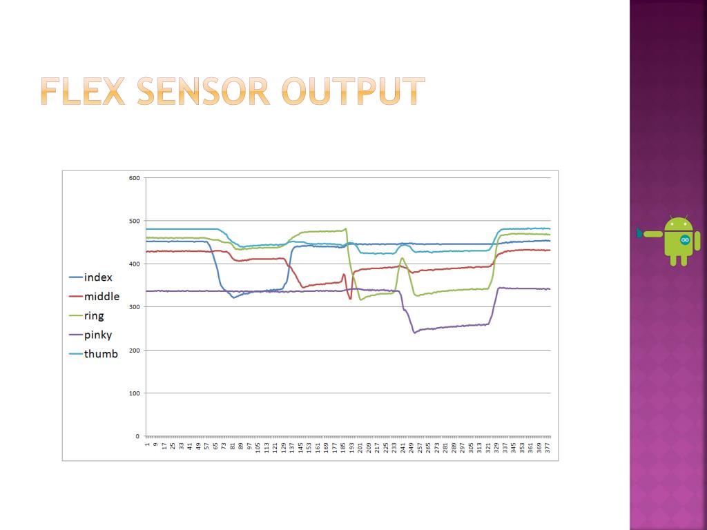 Flex sensor • Flex Sensor changes resistance when bent • Using a voltage divider the voltage is read by Arduino ADC (10 bits)