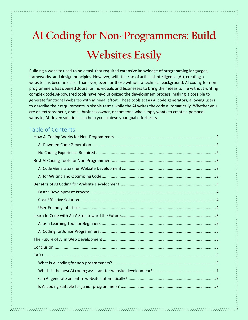 AI Coding for Non-Programmers: Build Websites Easily Building a website used to be a task that required extensive knowledge of programming languages, frameworks, and design principles. However, with the rise of artificial intelligence (AI), creating a website has become easier than ever, even for those without a technical background. AI coding for non- programmers has opened doors for individuals and businesses to bring their ideas to life without writing complex code.AI-powered tools have revolutionized the development process, making it possible to generate functional websites with minimal effort. These tools act as AI code generators, allowing users to describe their requirements in simple terms while the AI writes the code automatically. Whether you are an entrepreneur, a small business owner, or someone who simply wants to create a personal website, AI-driven solutions can help you achieve your goal effortlessly. Table of Contents How AI Coding Works for Non-Programmers ........................................................................................... 2 AI-Powered Code Generation ............................................................................................................... 2 No Coding Experience Required ........................................................................................................... 2 Best AI Coding Tools for Non-Programmers ............................................................................................. 3 AI Code Generators for Website Development .................................................................................... 3 AI for Writing and Optimizing Code ...................................................................................................... 3 Benefits of AI Coding for Website Development ...................................................................................... 4 Faster Development Process ................................................................................................................ 4 Cost-Effective Solution .......................................................................................................................... 4 User-Friendly Interface ......................................................................................................................... 4 Learn to Code with AI: A Step toward the Future ..................................................................................... 5 AI as a Learning Tool for Beginners ....................................................................................................... 5 AI Coding for Junior Programmers ........................................................................................................ 5 The Future of AI in Web Development ..................................................................................................... 5 Conclusion ................................................................................................................................................. 6 FAQs .......................................................................................................................................................... 6 What is AI coding for non-programmers? ............................................................................................ 6 Which is the best AI coding assistant for website development? ........................................................ 7 Can AI generate an entire website automatically? ............................................................................... 7 Is AI coding suitable for junior programmers? ..................................................................................... 7