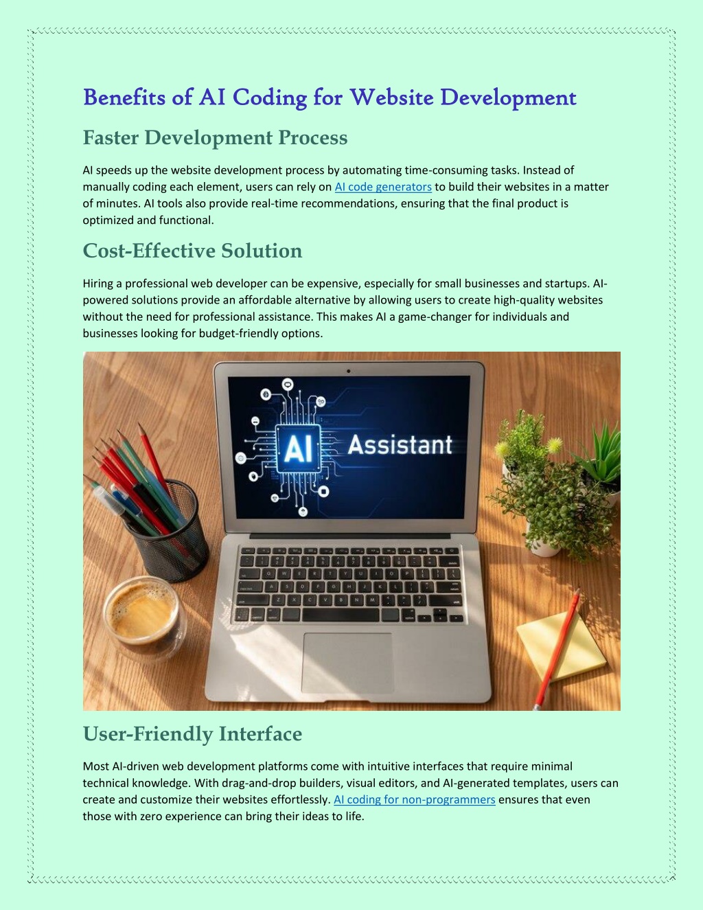 Benefits of AI Coding for Website Development Benefits of AI Coding for Website Development Faster Development Process AI speeds up the website development process by automating time-consuming tasks. Instead of manually coding each element, users can rely on AI code generators to build their websites in a matter of minutes. AI tools also provide real-time recommendations, ensuring that the final product is optimized and functional. Cost-Effective Solution Hiring a professional web developer can be expensive, especially for small businesses and startups. AI- powered solutions provide an affordable alternative by allowing users to create high-quality websites without the need for professional assistance. This makes AI a game-changer for individuals and businesses looking for budget-friendly options. User-Friendly Interface Most AI-driven web development platforms come with intuitive interfaces that require minimal technical knowledge. With drag-and-drop builders, visual editors, and AI-generated templates, users can create and customize their websites effortlessly. AI coding for non-programmers ensures that even those with zero experience can bring their ideas to life.