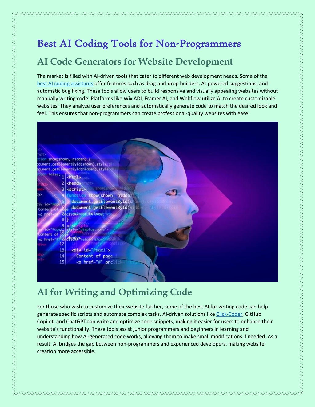 Best AI Coding Tools for Non Best AI Coding Tools for Non- -Programmers Programmers AI Code Generators for Website Development The market is filled with AI-driven tools that cater to different web development needs. Some of the best AI coding assistants offer features such as drag-and-drop builders, AI-powered suggestions, and automatic bug fixing. These tools allow users to build responsive and visually appealing websites without manually writing code. Platforms like Wix ADI, Framer AI, and Webflow utilize AI to create customizable websites. They analyze user preferences and automatically generate code to match the desired look and feel. This ensures that non-programmers can create professional-quality websites with ease. AI for Writing and Optimizing Code For those who wish to customize their website further, some of the best AI for writing code can help generate specific scripts and automate complex tasks. AI-driven solutions like Click-Coder, GitHub Copilot, and ChatGPT can write and optimize code snippets, making it easier for users to enhance their website’s functionality. These tools assist junior programmers and beginners in learning and understanding how AI-generated code works, allowing them to make small modifications if needed. As a result, AI bridges the gap between non-programmers and experienced developers, making website creation more accessible.